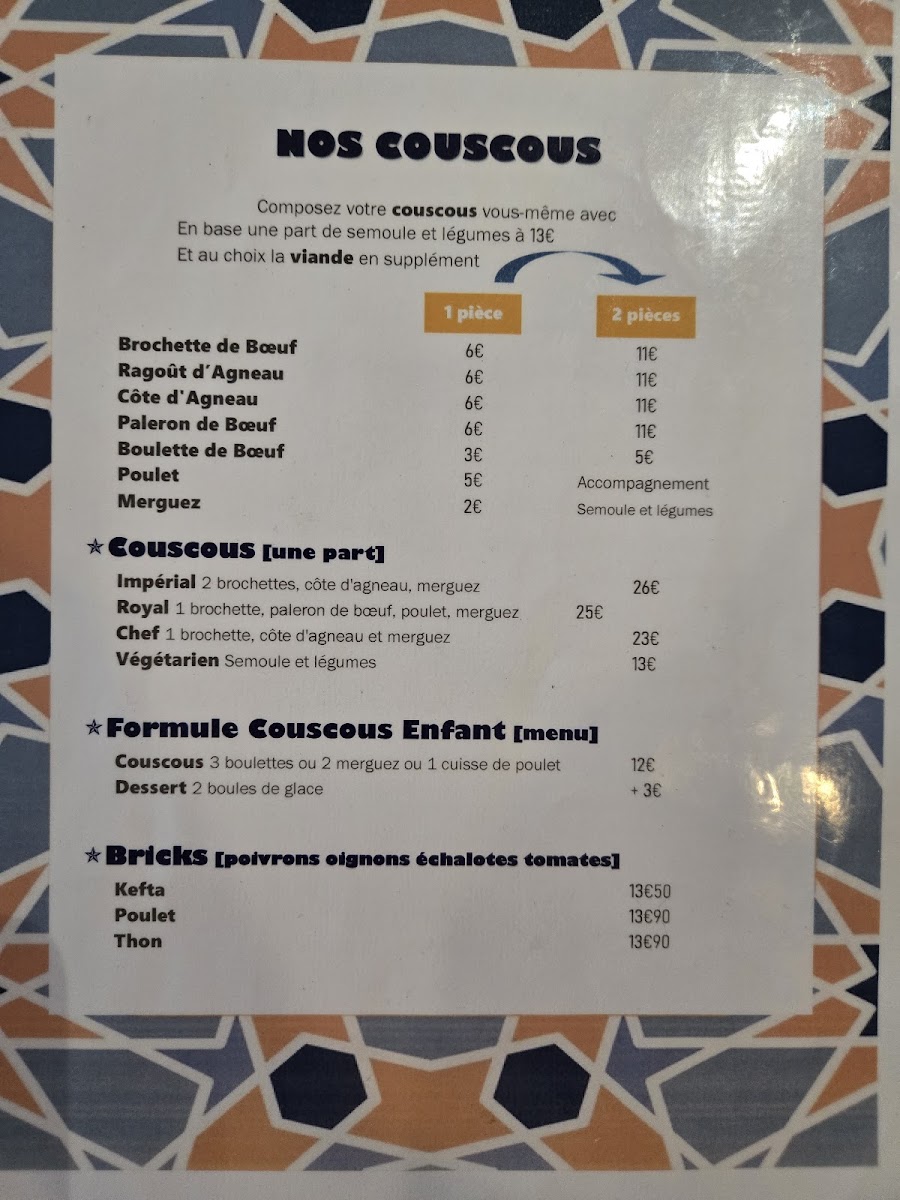 The menu showcases a variety of dishes, with the highlight being the couscous, praised for its rich texture and generous toppings—it's simply the best according to our patrons. Guests rave about the delicious olives and the charming Moroccan pastries that perfectly round off your meal. The warm and welcoming service complements the cozy ambiance, making for a truly enjoyable dining experience.